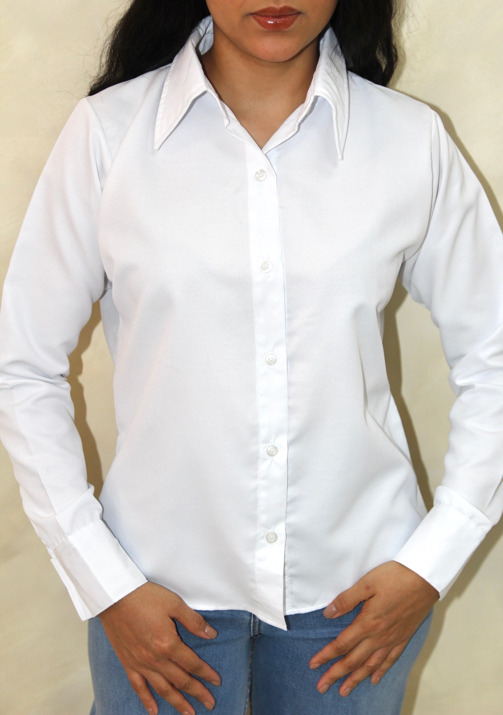 Camisa clásica está elaborada en una tela con textura de líneas delgadas, suave al tacto y con caída ligera (semi holgada).